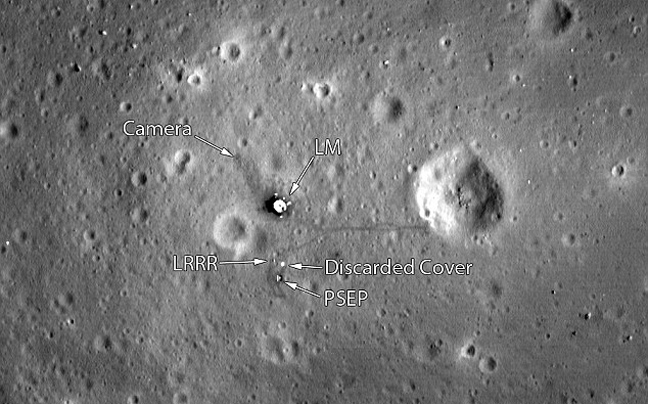 Τα πρώτα βήματα των αστροναυτών φαίνονται στα μαύρα σημεία γύρω από σεληνάκατο (Lunar Module), ενώ στην εικόνα επισημαίνονται και τα όργανα Passive Seismic Experiment Package (PSEP) και Laser Ranging RetroReflector (LRRR).