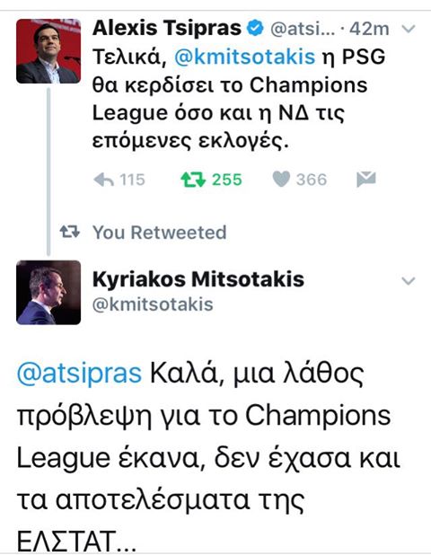 Ο Πρωθυπουργός, στον προσωπικό του λογαριασμό στο Twitter σχολίασε απευθυνόμενος προς τον πρόεδρο της Νέας Δημοκρατίας: «Τελικά, @kmitsotakis η PSG θα κερδίσει το Champions League όσο και η ΝΔ τις επόμενες εκλογές».